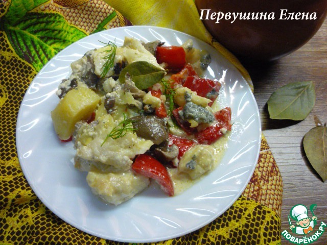| Очень вкусное и ароматное блюдо! Рыба с грибами и овощами - это что-то! А голубой сыр вносит свой неповторимый вкус и аромат! |