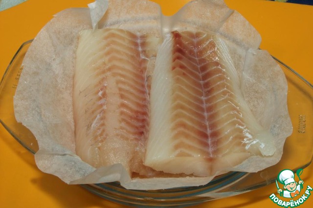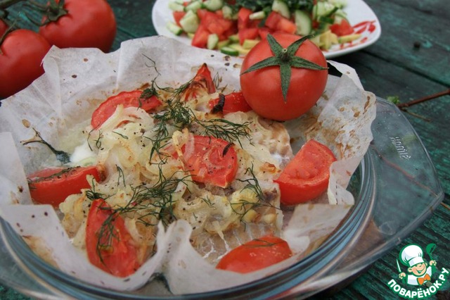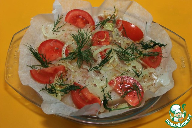 Рыбу положить в форму на пергамент, добавить 5-6 помидорок. Если у Вас черри, то целиком, ну а если как у меня обычные не очень крупные на ветке, то разрезать их на четыре части. Сверху филе разложить пассированный лук и нарезанный свежий укроп. Сбрызнуть оливковым маслом, соком лимона. Добавить соль и перец по вкусу. Подготовленную рыбу отправить в разогретую до 200 градусов духовку минут на 25.