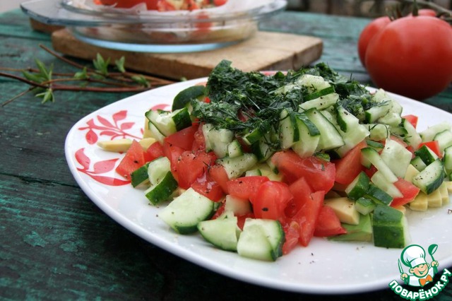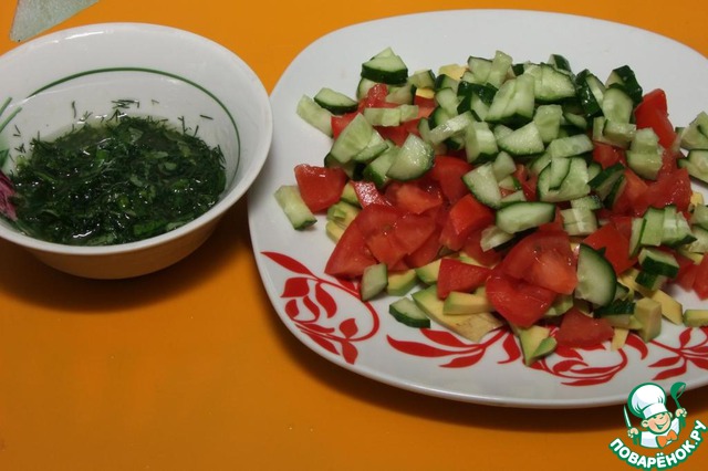 А тем временем приготовим овощную сальсу. Для этого авокадо почистим и нарежем мелкими кусочками. Помидоры и огурцы помоем и также нарежем. Положим овощи в глубокую тарелку. Зелень (у меня базилик и укроп) мелко нарежем, смешаем с 3 столовыми ложками оливкового масла и соком лимона, заправим овощную смесь и тщательно все перемешаем. Нужно еще сальсу хорошенько поперчить и обязательно посолить во вкусу.