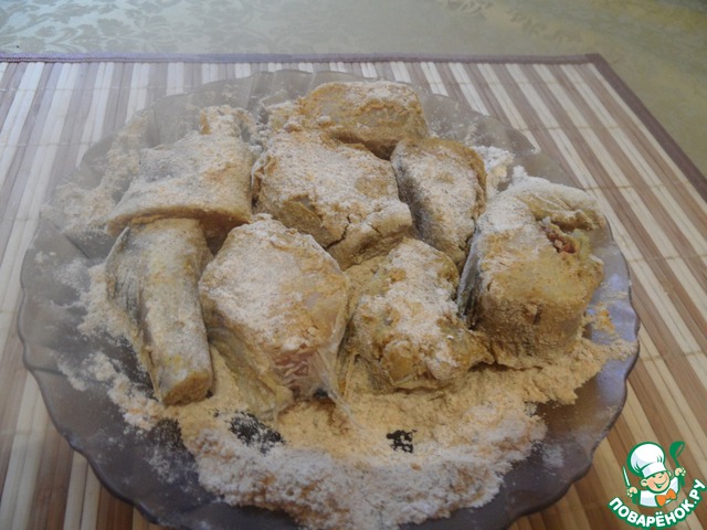 Приготовить панировку. Муку перемешать с солью и специями. Каждый кусочек рыбки обвалять в муке.