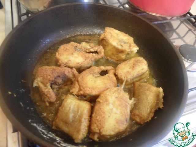 Выложить кусочки в разогретую сковородку с маслом. Обжаривать до золотистого цвета но не пересушить. Рыбка жарится очень быстро.