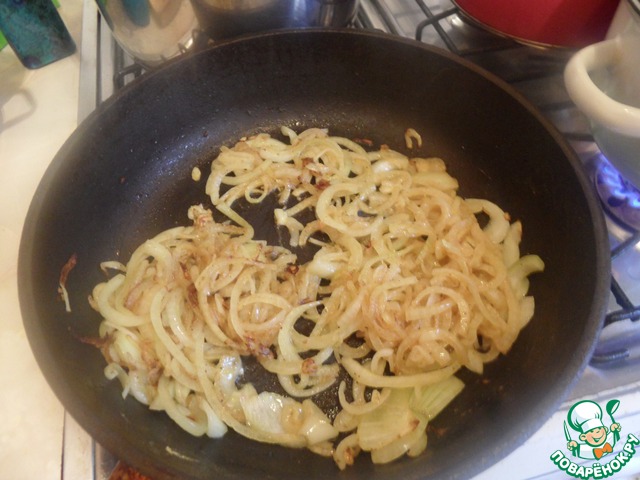 Минтай пока выложить на тарелочку, а в масле обжарить лук до золотистости.