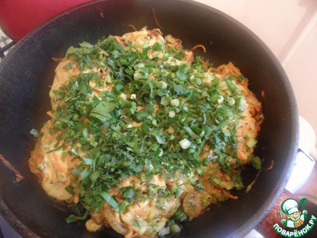 На сковородку выложить рыбку, далее овощи, залить соусом, закрыть крышкой притушить 5 минут, посыпать мелко порезанной зеленью.