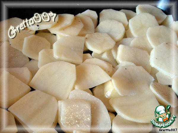Картофель очистим, нарежем ломтиками, посолим, приправим перцем, сбрызнем растительным маслом и выложим в форму для запекания.