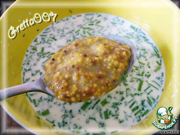 В сливки добавляем измельченную зелень петрушки и горчицу, хорошо перемешиваем.