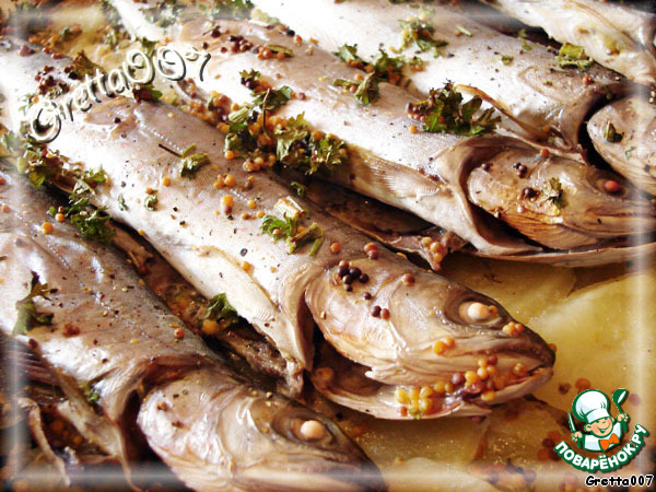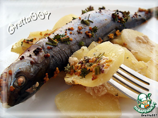 | Запеченная рыбка с потрясающе вкусным картофелем. В этом простом блюде можно использовать и любую другую, небольшую и не очень жирную рыбу. |