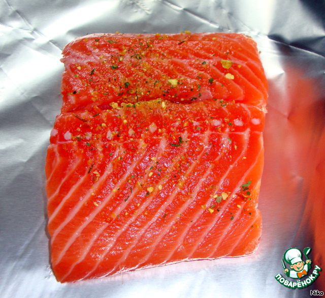 Рыбу посыпать солёной смесью и чёрным молотым перцем.