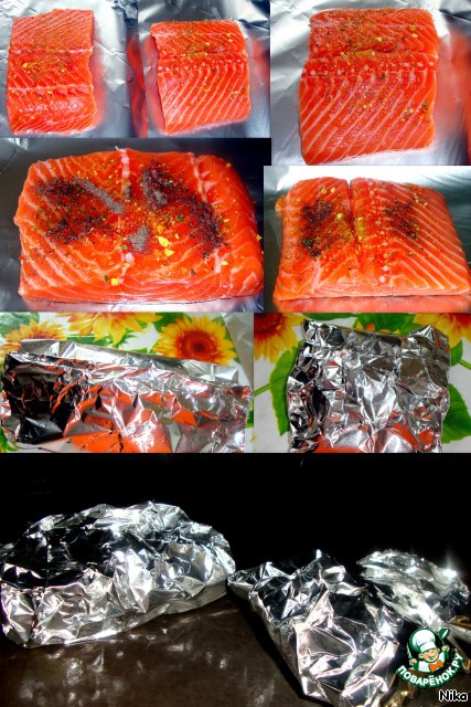 Каждый кусочек завернуть в фольгу и поставить в разогретую до 200 градусов духовку. Я обычно вынимаю рыбу, когда чувствую сильный рыбный запах, примерно через 10-15 минут. Лосось получается сочный, хотя и без масла. Подавать к столу с зеленью, овощами. Приятного аппетита *OK* :-)