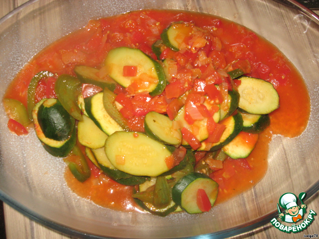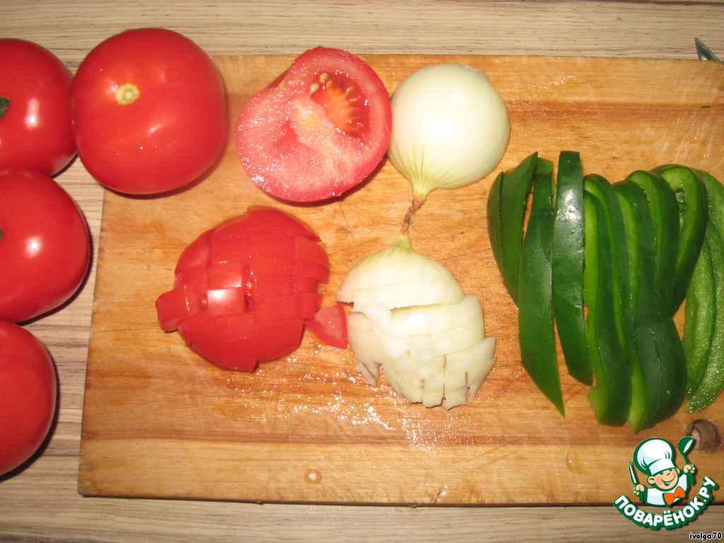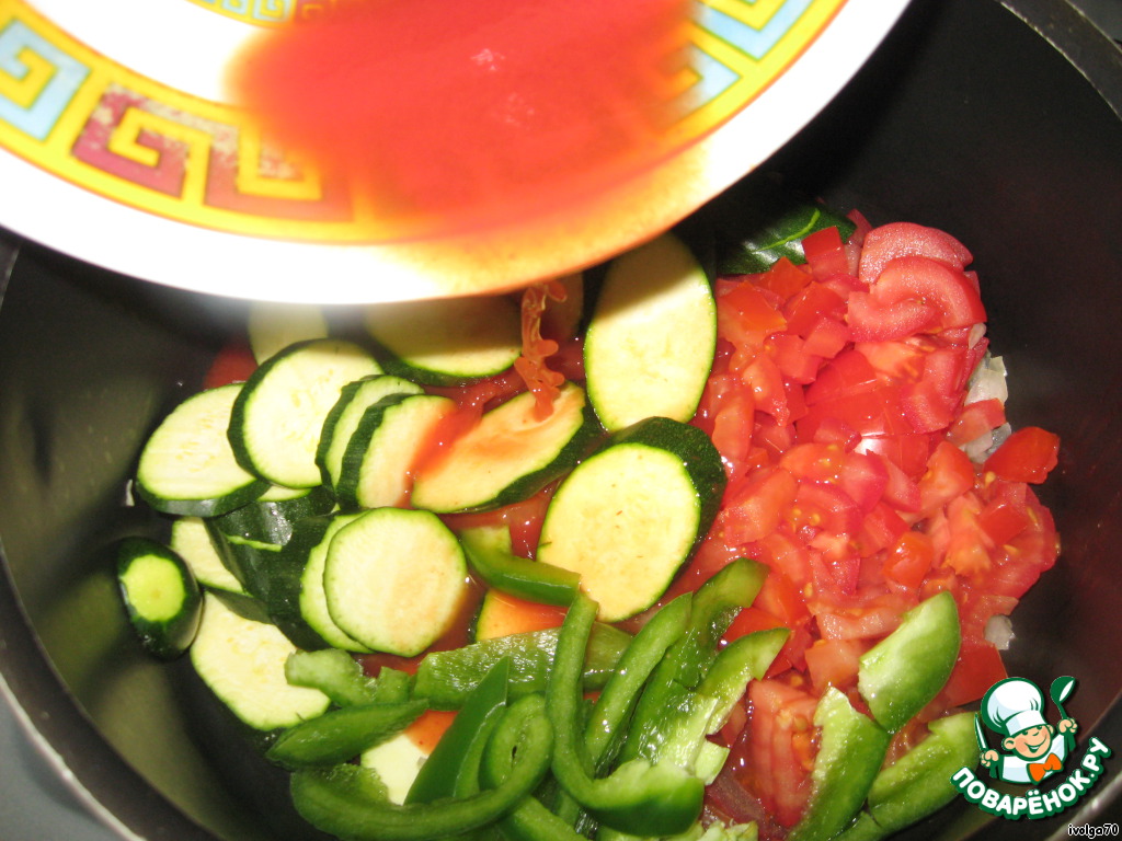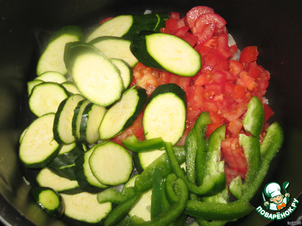 Добавляем к готовому лучку томаты, цуккини и зеленый перец.