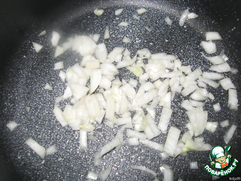 Спрыскиваем нашу кастрюлю низкокалорийным спреем и на медленном огне обжариваем лук до прозрачности (3 минутки).