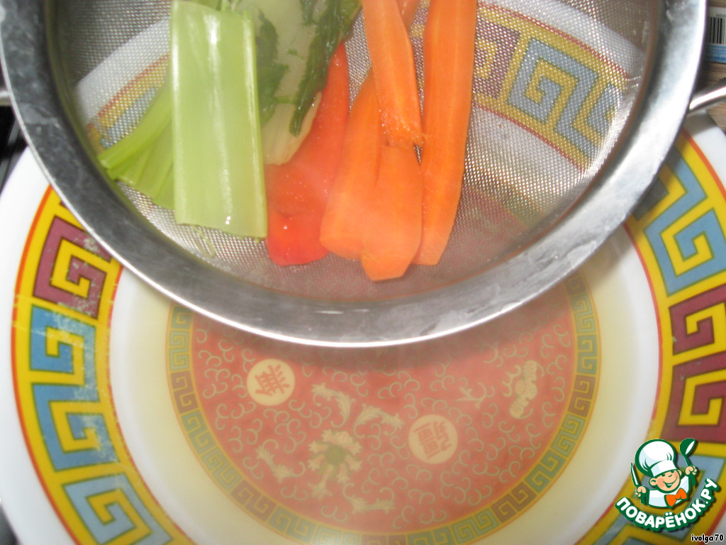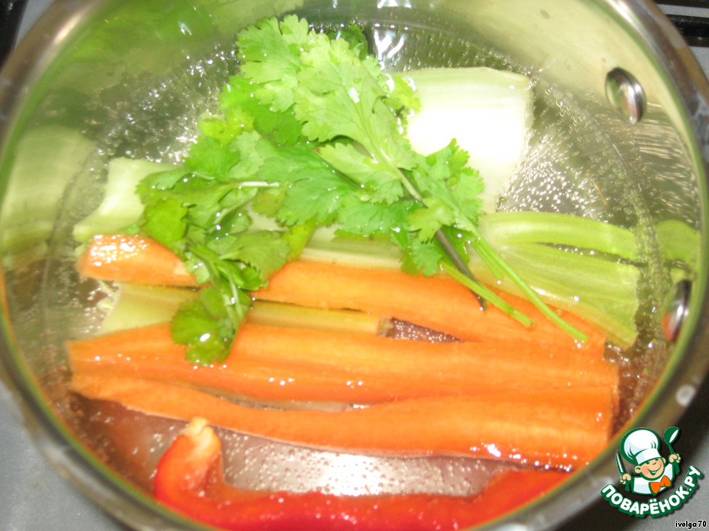 2. варим бульончик сами. Для этого я положила в 150 мл воды морковочку, сельдерей и болгарский перчик. Варим минут 15