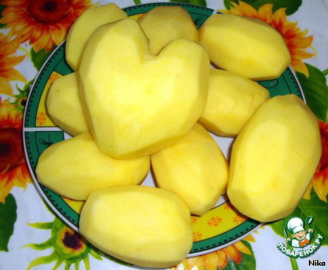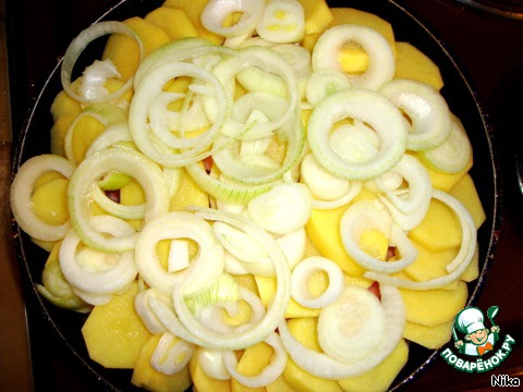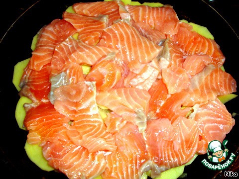 В сковороду выложить в два ряда картофель, сверху лосось.
