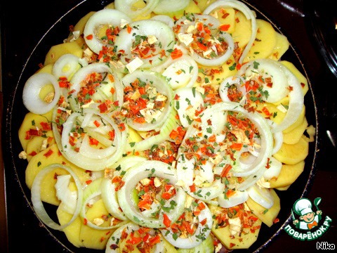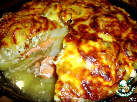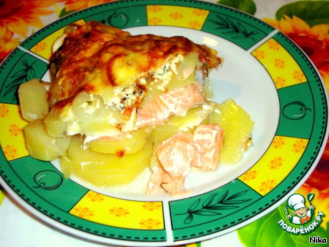 | Запечeнный лосось с картофелем, луком и сырной корочкой. |