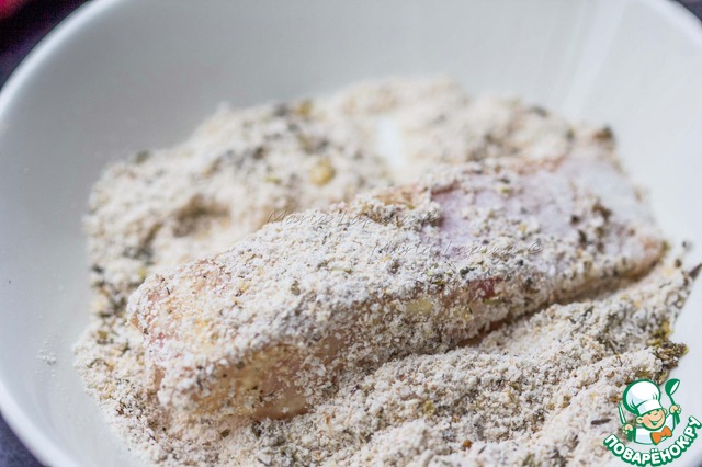 Затем в хлопьях с травами. Выкладываем все кусочки в форму или другой противень постелив пекарскую бумагу. Немного смазываем растительным маслом. Запекаем на среднем уровне духовки 15 минут при температуре 180С. Время приготовления может увеличиваться или уменьшаться в зависимости от толщины и велечины ваших кусочков.