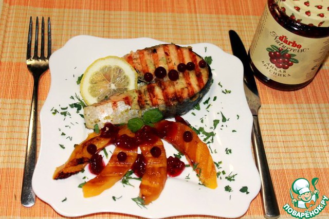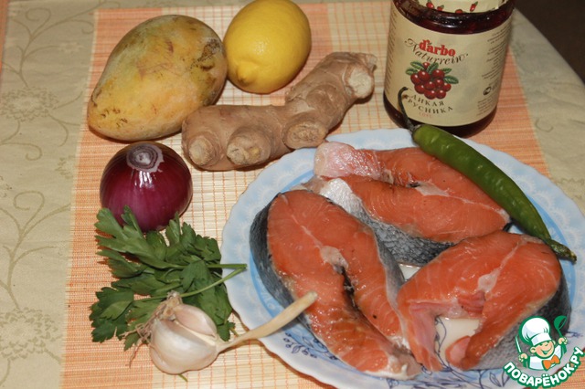Блюдо посыпать мелко-порубленной зеленью, уложить стейк лосося, манго, полить брусничным соусом, украсить лимоном и ягодками брусники