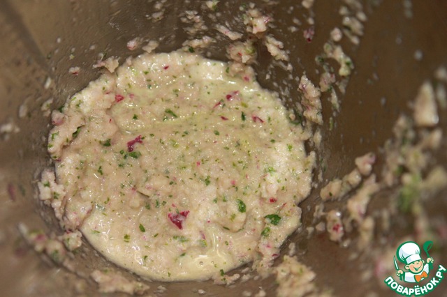 Смешать в блендере 30г лимонного сока, чеснок, петрушку, лук, имбирь, перец чили, пробить до однородной пасты