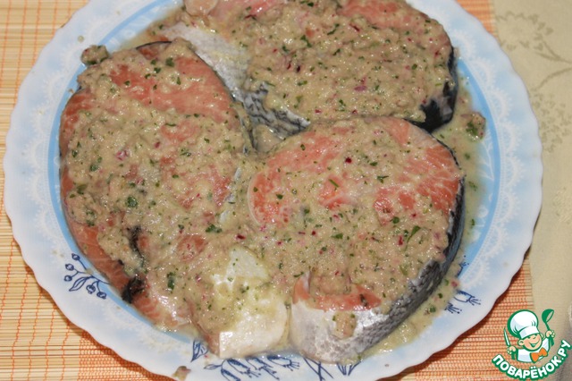 Смазать маринадом стейки лосося и оставить на 10 минут мариноваться