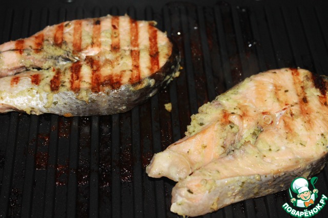 Обжарить на гриле стейки лосося по 4 минуты на 200 градусах с каждой стороны