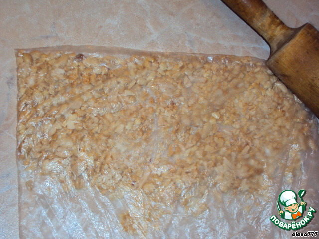 Высыпать орехи в пакет и размять скалкой.