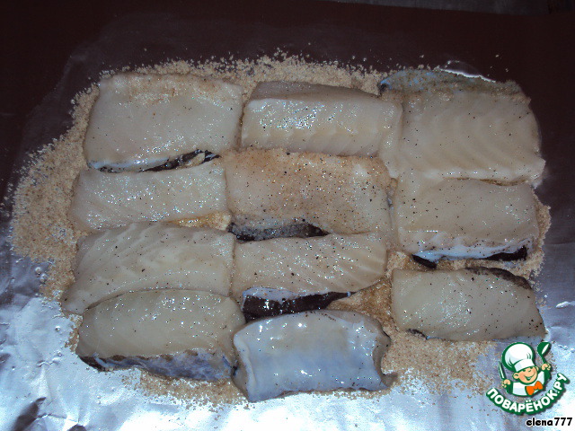 На противень постелить фольгу, смазать её растительным маслом и посыпать панировочными сухарями, выложить сверху кусочки рыбы.