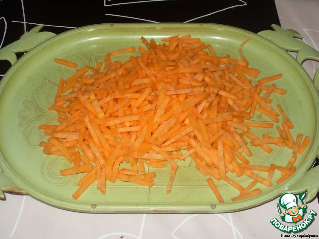 Морковь очистить и нарезать соломкой или натереть на крупной терке.