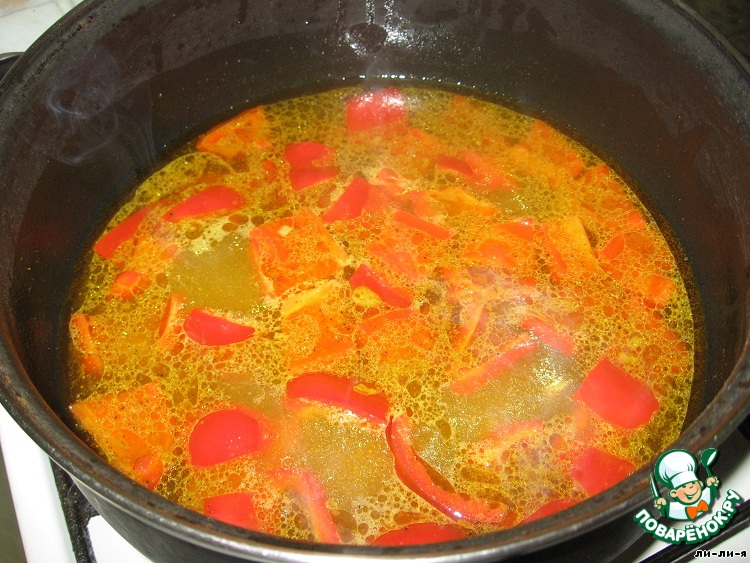 Налить 2,5-3 стакана кипятка. Посолить и поперчить по вкусу.