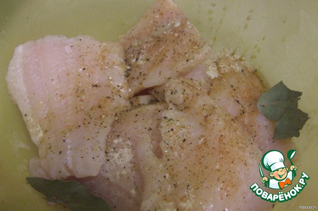 Филе рыбное мы нарезаем порционными кусочками, это как вам захотелось. Я порезала крупными кусочками и мне так больше понравилась. Рыбку нужно немного замариновать, добавляем соль и специи для рыбы по вкусу, также можно положить лавровый листик.Немного лимонного сока и растительного масла. Рыбку перемешиваем и оставляем примерно на 15 минут для маринования.