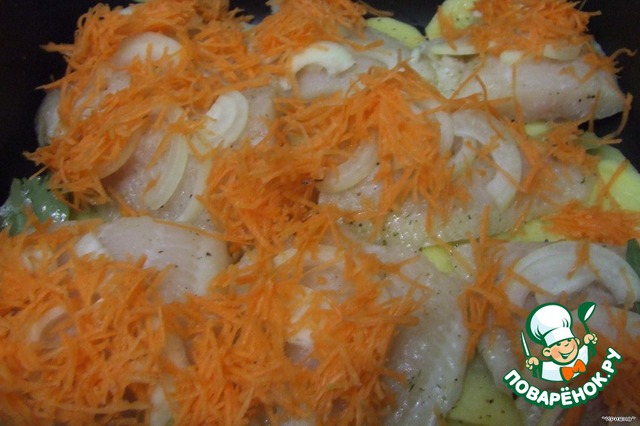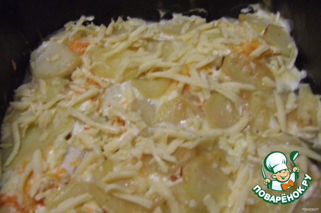 Примерно через 30 минут можно добавить не много водички или бульона. Для сочности рыбки и картофеля. Посыпаем всё тёртым сыром и ставим ещё на 10 - 15 минут для получения румяной корочки.