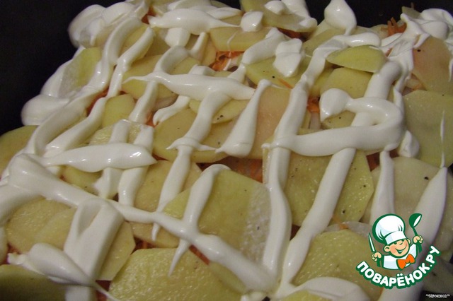 И на морковку выкладываем опять слой картофеля. В сё смазываем майонезом и ставим в духовку.