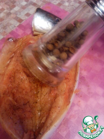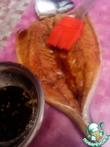 Кисточкой обильно смачиваем рыбу маринадом, оставляем на 20 минут