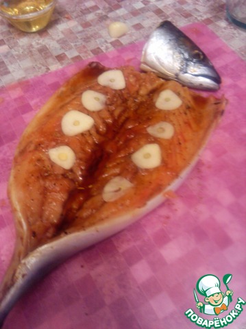 Нарезаем тооооненькими пластинками чеснок, выкладываем на рыбу