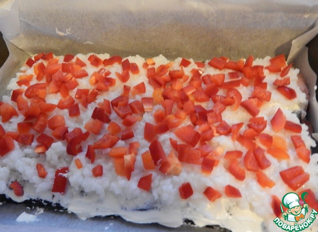 Выкладываем оставшийся рис и порубленный болгарский перец.