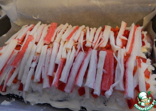 Накрываем это листами нори, и наносим наш "салат" из креветок и крабовых палочек, твердого сыра.