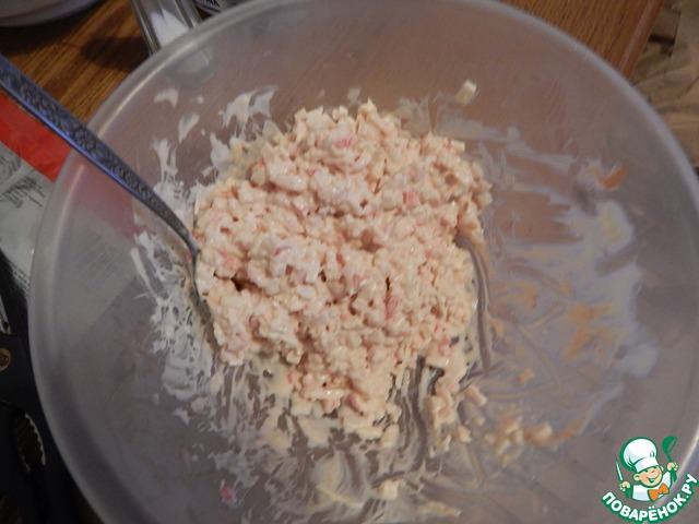 Добавляем крабовые палочки, мы порвали их такими лоскутками.