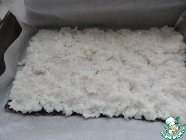Подготавливаем ингредиенты- отвариваем рис (тут мы не заморачивались, так как не столь важно, в какой степени липким он будет ), добавляем рисовый уксус в отваренный рис, оставляем остывать. за часа два до готовки стоит замариновать лосось с лимоном. Так же заготавливаем "начинку" для верхушки нашего торта- трем твердый сыр, добавляем креветки, и 5 крабовых палочек мелко порезанных, заправляем сметаной, кетчупом, майонезом. Масса не должна течь.