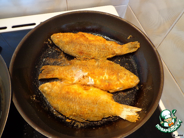 Карасей почистить и замочить в молоке на час, можно больше. Обсушить полотенцем, обвалять в панировке и обжарить. Я обычно смешиваю панировочные сухари, муку пшеничную, кукурузную, немного паприки молотой, соль.