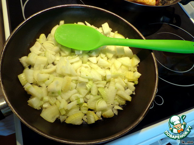 Лук нарезать и обжарить на растительном масле до золотистого цвета.
