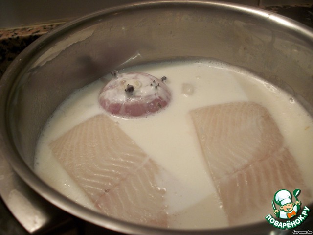 Эту луковичку поместим в молоко и нагреем. Туда же положим рыбку и припустим ее в этом отваре до готовности.