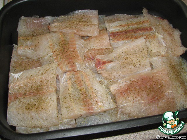Каждую половинку филе рыбы разрезать на три части, посолить и посыпать специями с двух сторон. Отставить в сторону, чтобы рыба немного промариновалась.