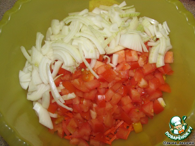 Помидоры нарезать кубиками, лук - четвертинками колец.