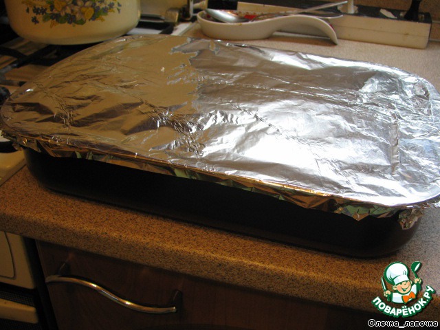 Накрыть фольгой и поставить в разогретую до 180 градусов духовку. Через 10-15 минут фольгу снять и оставить дальше запекаться еще минут 25-30.