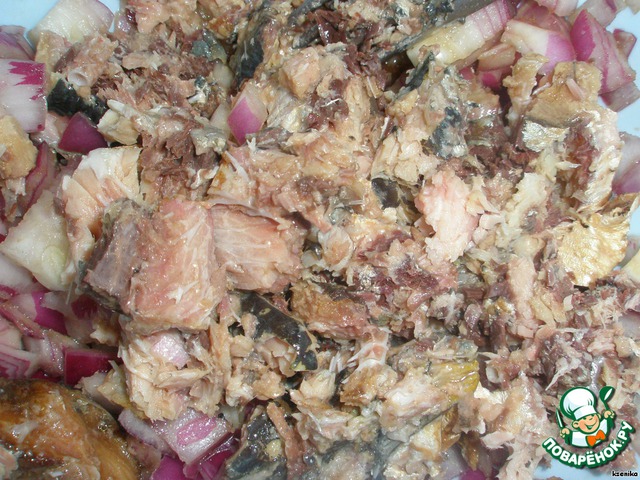 С консервы сольем жидкость и помнем вилкой, но не сильно.