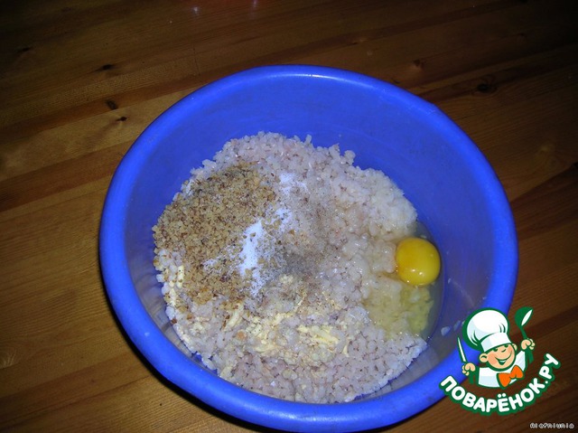 Добавить измельченные в блендере орехи, яйцо; посолить, поперчить. Все хорошо вымешать.