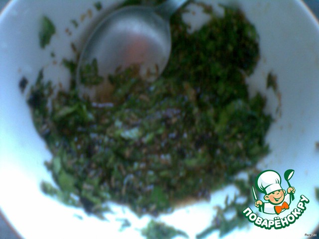 Приготовила такую заправочку: выжала сок половины лимона, мелко порубила зелень, добавила в сок, специи, соевый соус и хорошо перемешала.