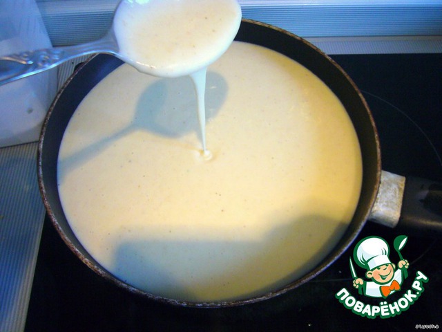Готовим соус Бешамель: Муку пассируем на слив. масле, растирая её до мелких крупинок (см.фото). Добавляем небольшими порциями молоко, тщательно вымешивая от комков. Если комков избежать не удалось - протрите всю эту красоту через мелкое ситечко.