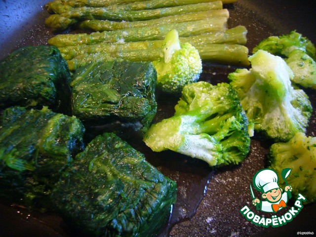 Замороженный шпинат солим и тушим на растительном масле до готовности (минут 7-10). Готовила ещё одну лазанью, со спаржей и брокколи. Тушила в одной большой сковороде, есстественно, не перемешивая.