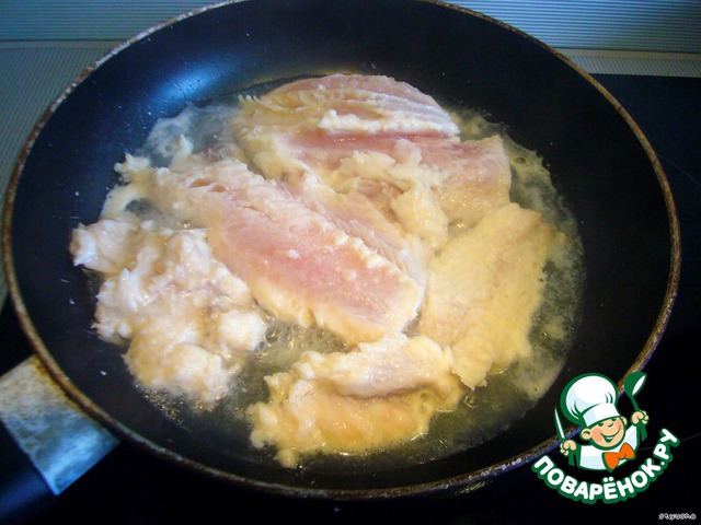 Филе рыбы выкладываем на сковороду без масла, солим, заливаем белым вином и тушим минут 10.