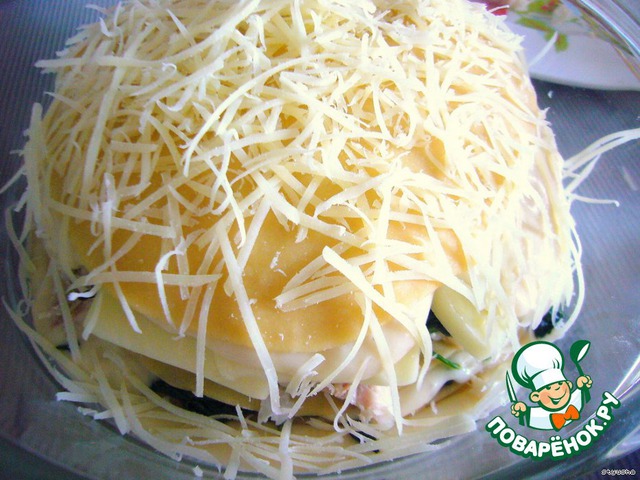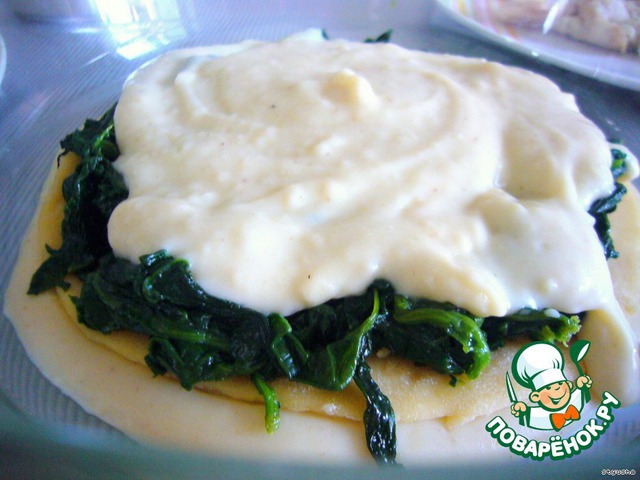 Собираем лазанью слоями в следующей последовательности: соус, тонко раскатанный пласт теста, часть шпината, соус,