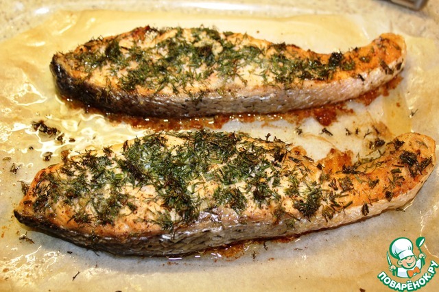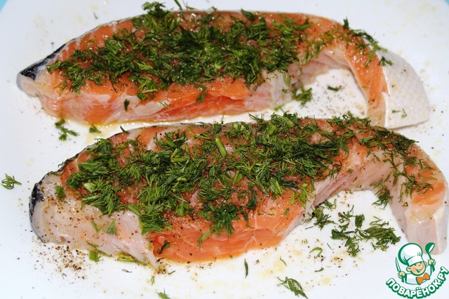 Стейки с двух сторон смазала оливковым маслом, затем натерла солью и перцем, сверху посыпала, слегка прихлопывая пальцами, мелкорубленную зелень укропа. Отставила на 10 - 15 минут мариноваться.