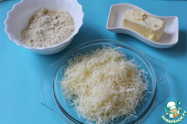 Мелко измельчила орехи, сыр натерла на средней терке, рядышком разместила плошечку со сливочным маслом (забыло о масле, когда фотографировала продукты).